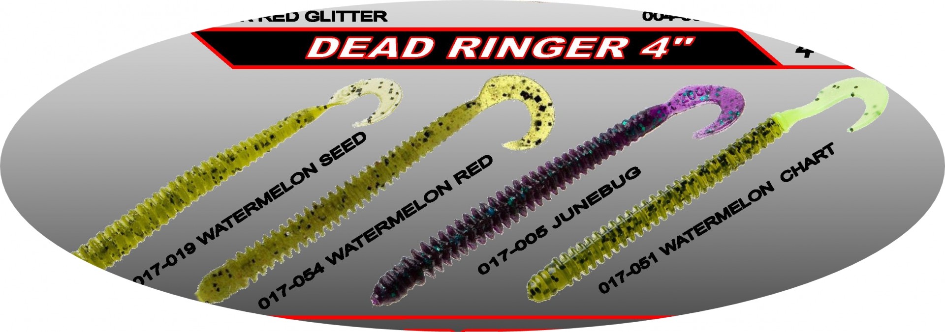 Quatro iscas artificiais Dead Ringer 4 polegadas em várias cores com etiquetas visíveis.