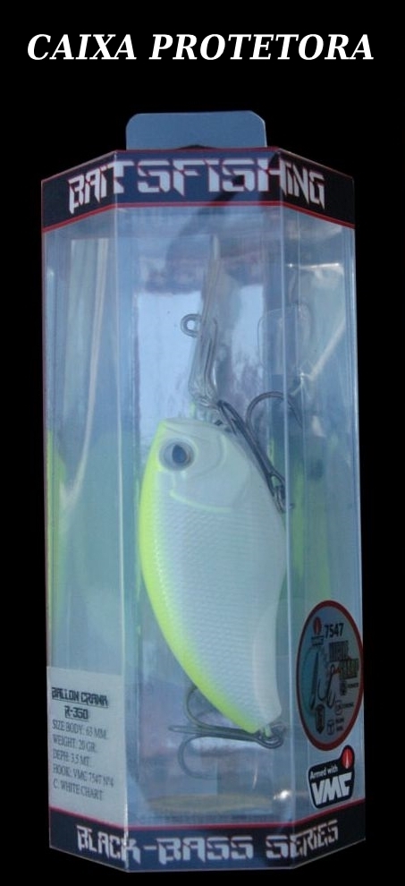 Isca artificial branco com amarelo dentro de caixa protetora transparente