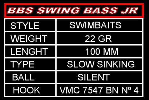 Tabela de especificações do produto BBS SWING BASS JR com fundo preto e texto branco