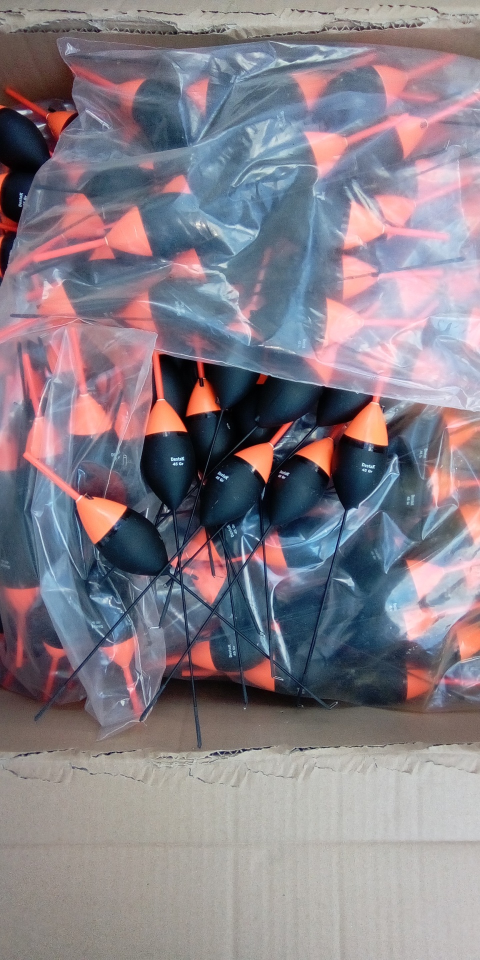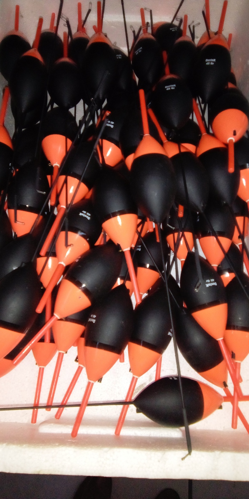 Bóias de pesca pretas e laranja numa caixa de poliestireno