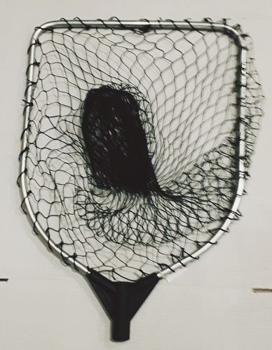 Rede de pesca quadrada com armação metálica e malha preta pendurada numa parede branca