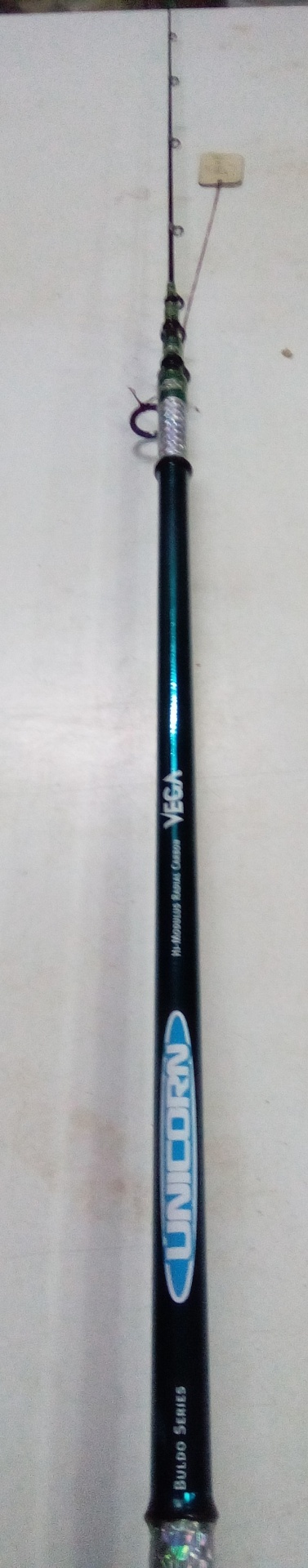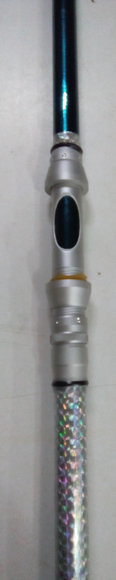 Punho e parte do cabo de uma cana de pesca com detalhes prateados e holográficos