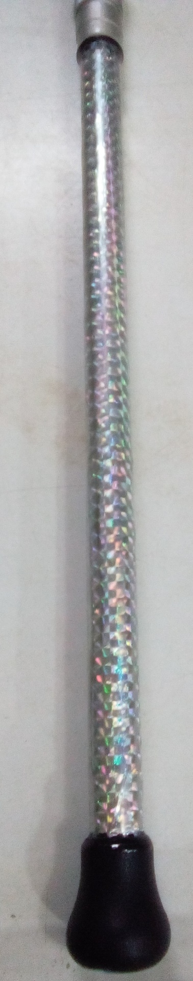 Bengala prateada com padrão holográfico, tampa preta e bocal metálico