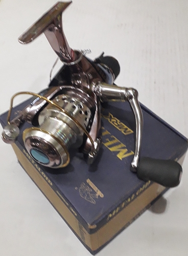 carreto de pesca metálico prateado com punho preto em caixa azul