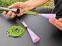 Pessoa segura bastão de trekking com corda verde e ferramenta lilás numa mesa preta