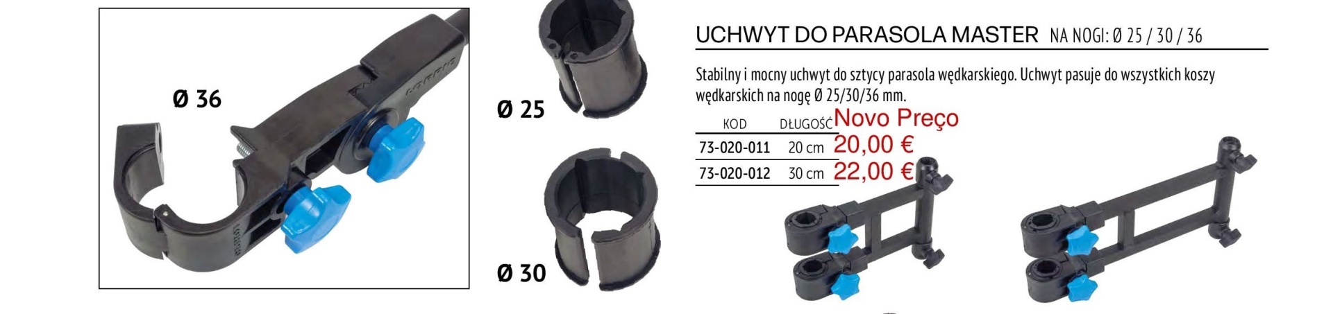 Suporte de guarda-chuva forte e estável. Cabe o pé redondo Ø 25 mm e o quadrado 20x20 mm. Borracha redutora para pernas mais finas Ø 20 mm incluídas. Blocos de fixação em compósito forte e durável, estrutura em alumínio leve e rígido. Os parafusos de aperto do espigão de selim são arredondados a partir da frente para evitar ferimentos no espigão do guarda-chuva.