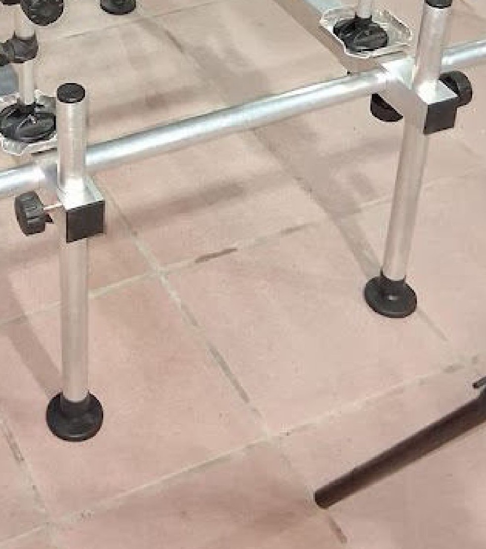 Estrutura metálica prateada com pés em plástico preto sobre piso de ladrilhos bege