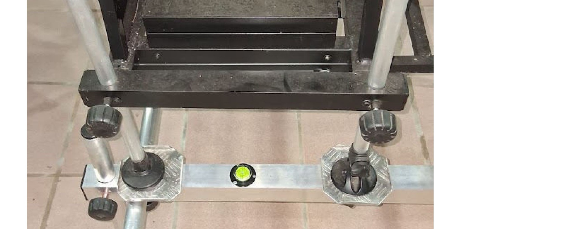 Estrutura metálica regulável com plataforma de barras pretas em chão de azulejos