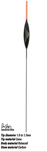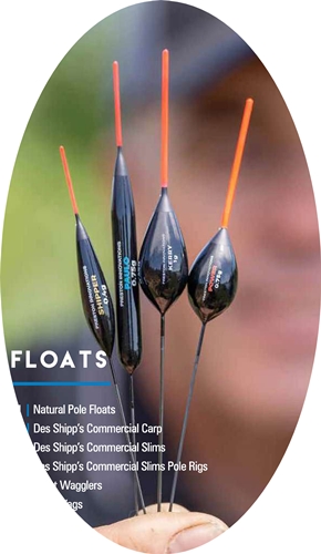 Conjunto de quatro boias de pesca pretas com ponteiras laranja, texto impresso, sendo seguradas pela mão em fundo desfocado.